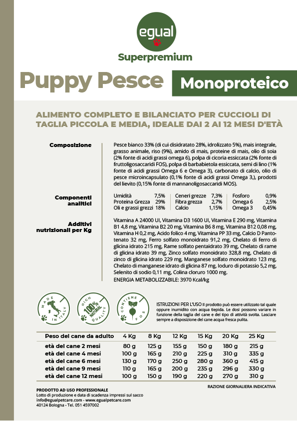 EGUAL Puppy Pesce Monoproteico - Alimento completo e bilanciato per cuccioli di taglia piccola e media, ideale dai 2 ai 12 mesi d'età.