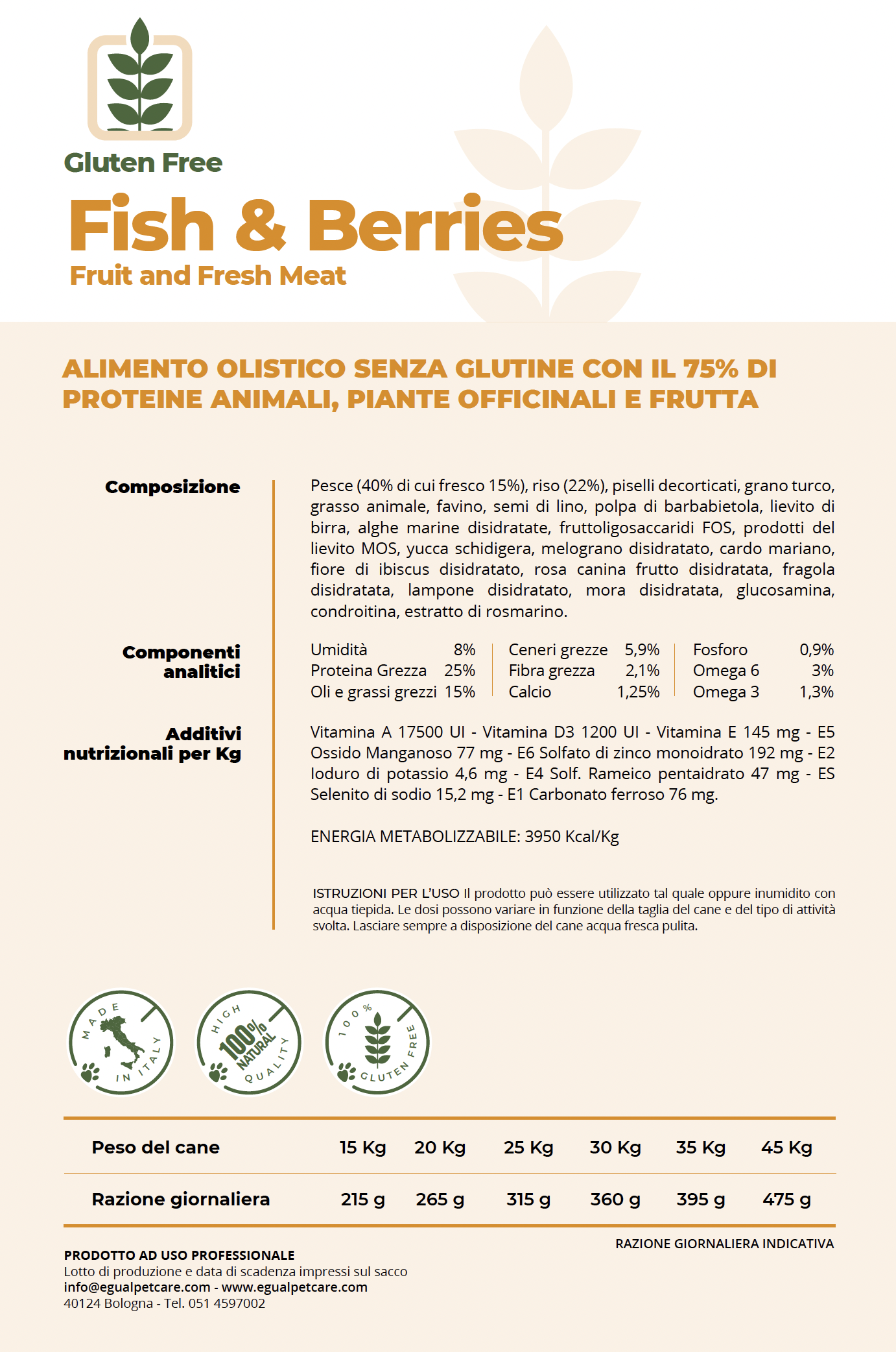 EGUAL Fish & Barriers - Alimento olistico per cani con il 75% di proteine animali. Senza glutine, ricco di pesce, piante officinali e frutta per un benessere completo. Supporta la salute articolare e la digestione.