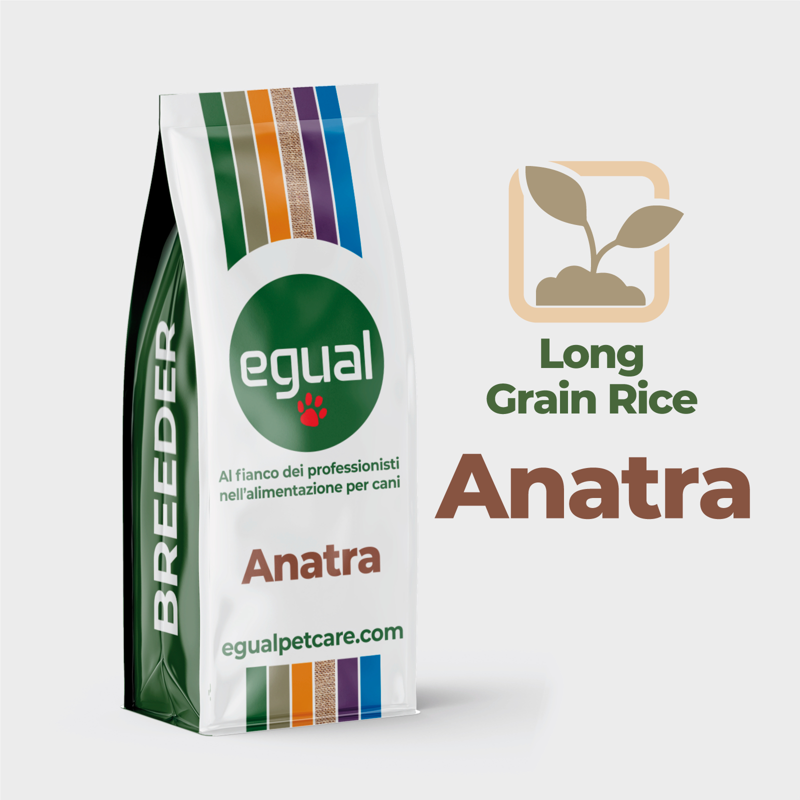 EGUAL Anatra è un mangime olistico low grain per cani, ricco di proteine ad alta digeribilit da carne disidratata di anatra e cavallo, fiocchi di riso, e verdure essiccate. Senza conservanti, BHT, BHA o etossichina, per una nutrizione sana e naturale.