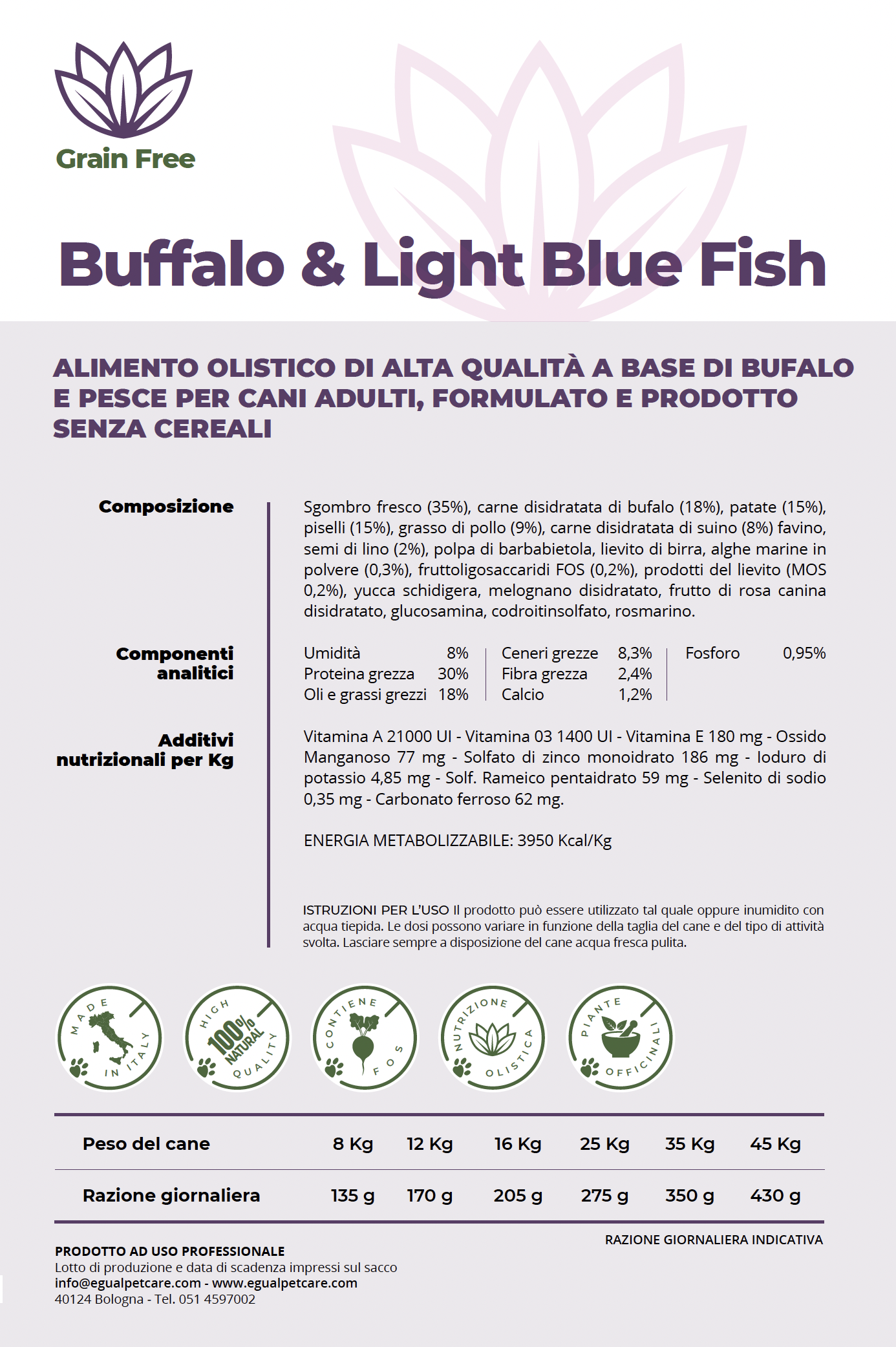 EGUAL Buffalo & Light Blue Fish è un mangime olistico senza cereali, formulato per cani adulti con una dieta ricca di bufalo, sgombro fresco e pesce. Ideale per una nutrizione sana e bilanciata, senza cereali e con ingredienti naturali di alta qualità.