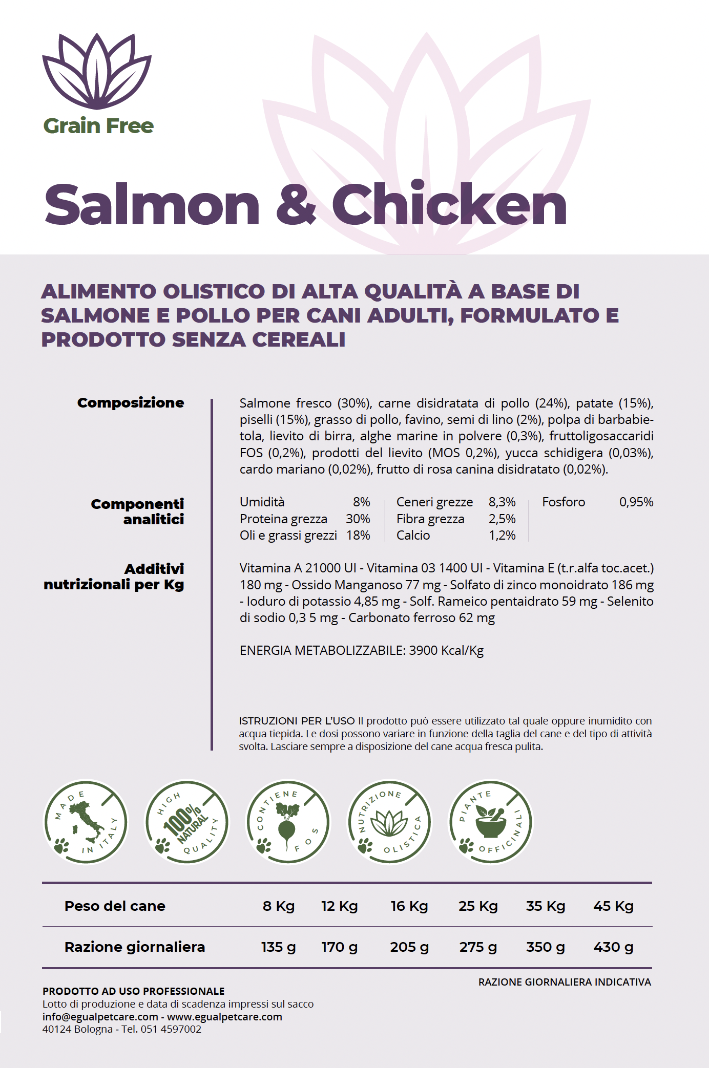 EGUAL Salmon & Chicken è un mangime olistico di alta qualit per cani adulti, a base di salmone fresco e pollo, formulato senza cereali. Offre una nutrizione sana e bilanciata con ingredienti naturali e altamente digeribili per il benessere del tuo cane.