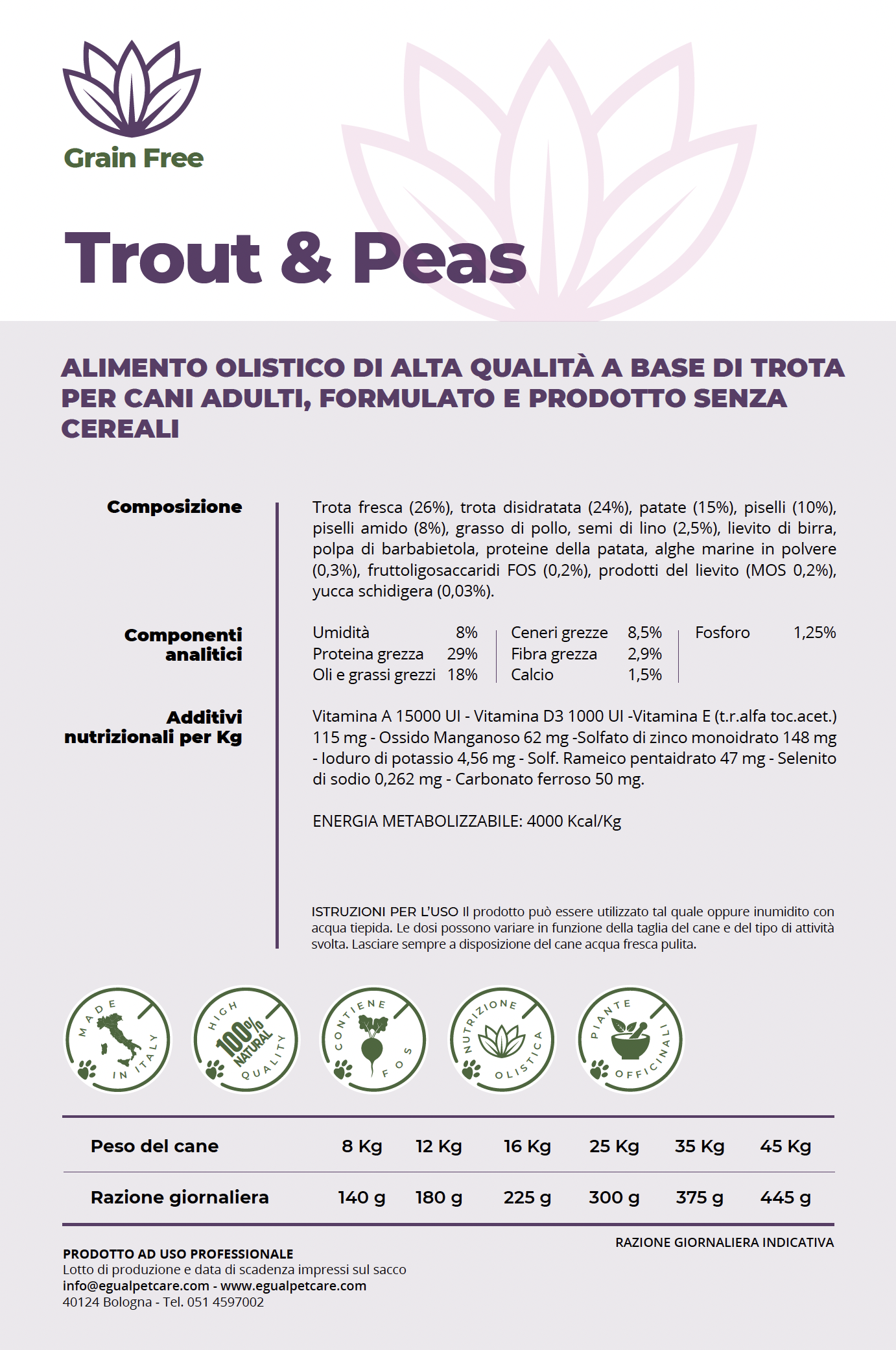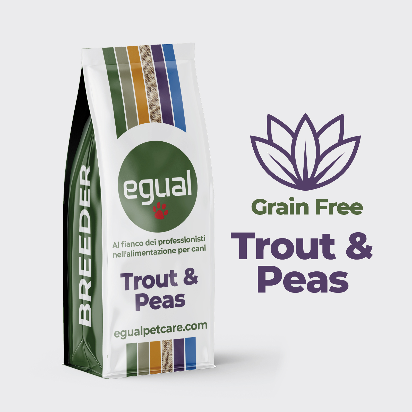 EGUAL Trout & Peas è un mangime olistico senza cereali, formulato per cani adulti con trota fresca e disidratata. Un'alimentazione sana e ricca di nutrienti, con piselli e ingredienti naturali, per un cane attivo e in salute.