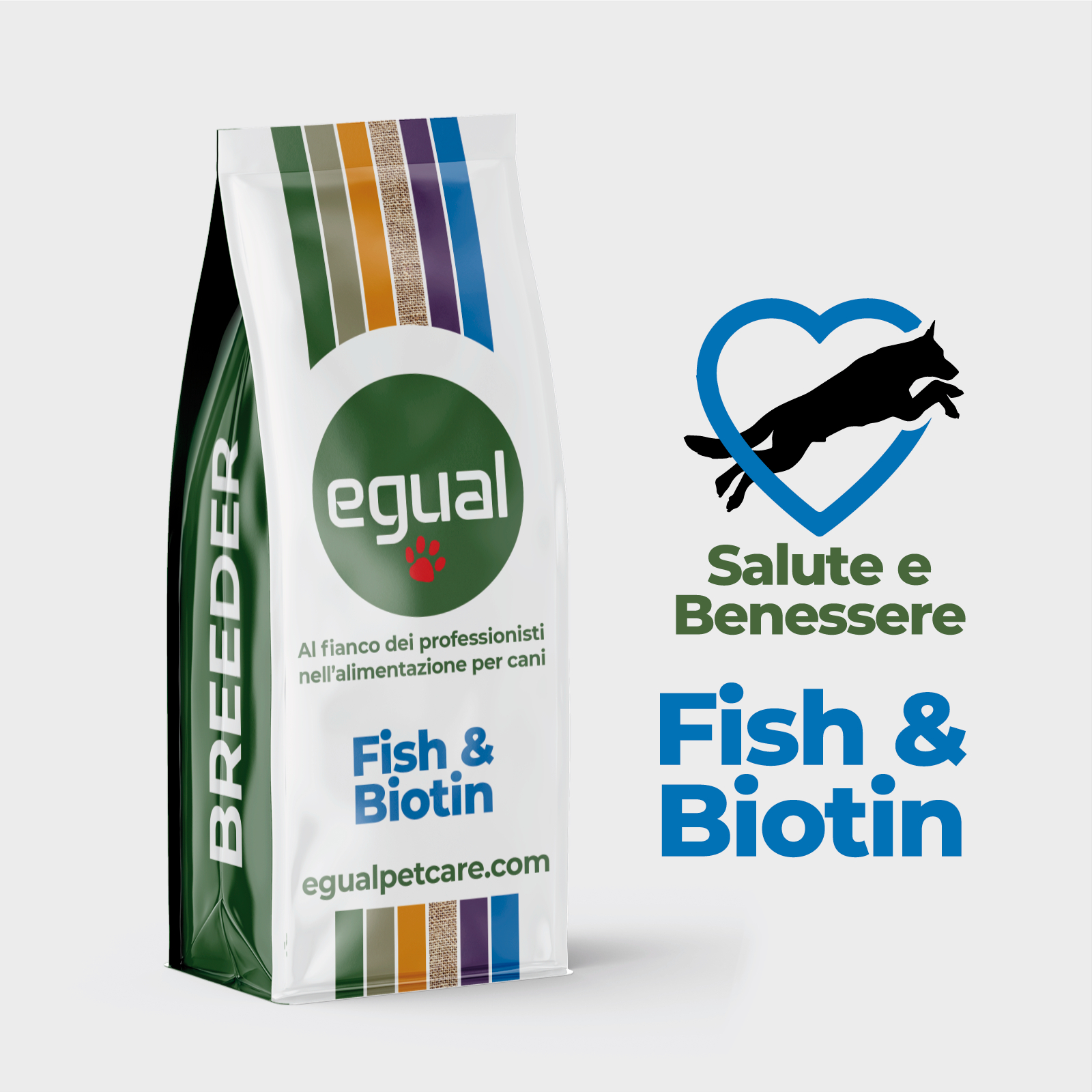 EGUAL Fish & Biotin è un mangime completo per cani arricchito con biotina, olio di salmone, alghe marine e litotamnio, ideale per favorire la crescita del pelo e migliorare la salute della pelle. Senza conservanti, per una nutrizione sana e bilanciata.