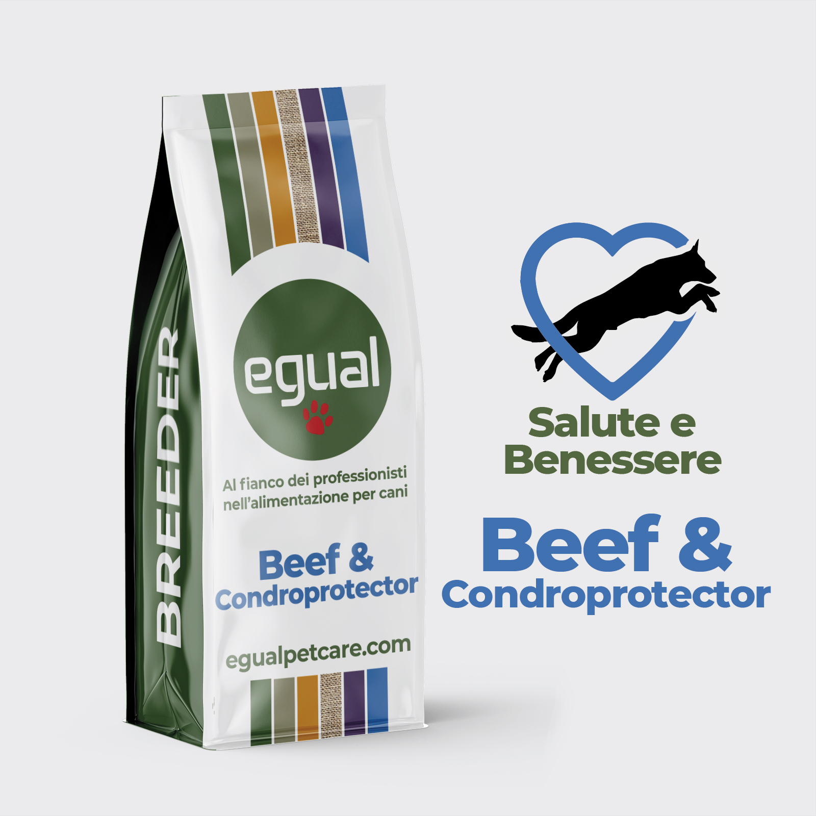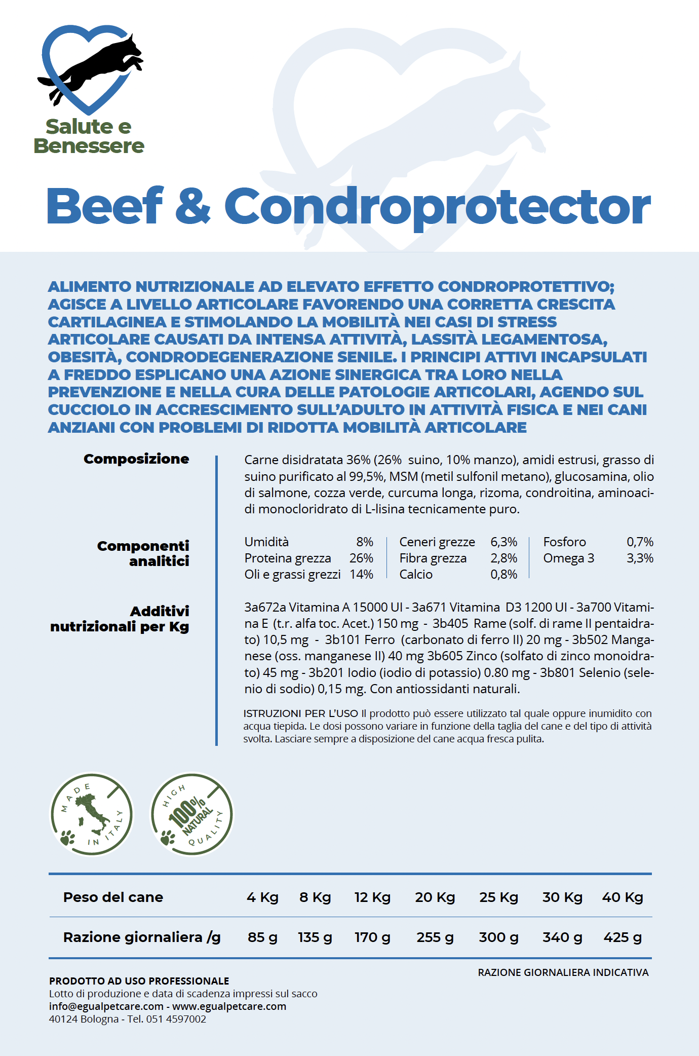 EGUAL Beef & Condroprotector è un mangime nutrizionale con effetto condroprotettivo, ideale per cuccioli in crescita, cani attivi e anziani con problemi articolari. Arricchito con glucosamina, condroitina e MSM, stimola la mobilit articolare e favorisce una crescita cartilaginea sana.