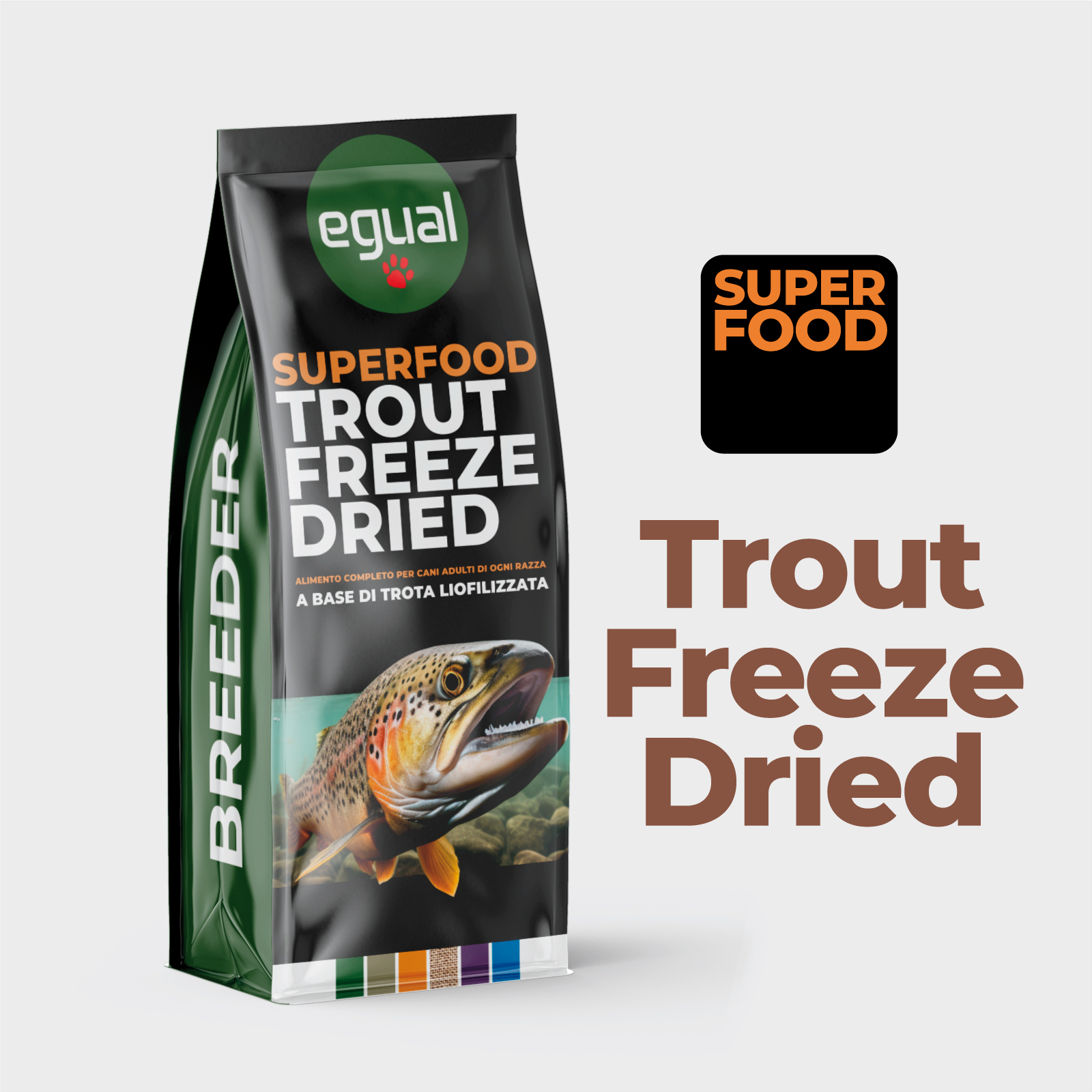 EGUAL Trout Freeze Dried è un mangime completo per cani adulti di ogni razza, con pesce bianco e trota liofilizzata. Arricchito con frutti rossi disidratati e spirulina, questo alimento superfood supporta la salute generale e la vitalit del tuo cane.
